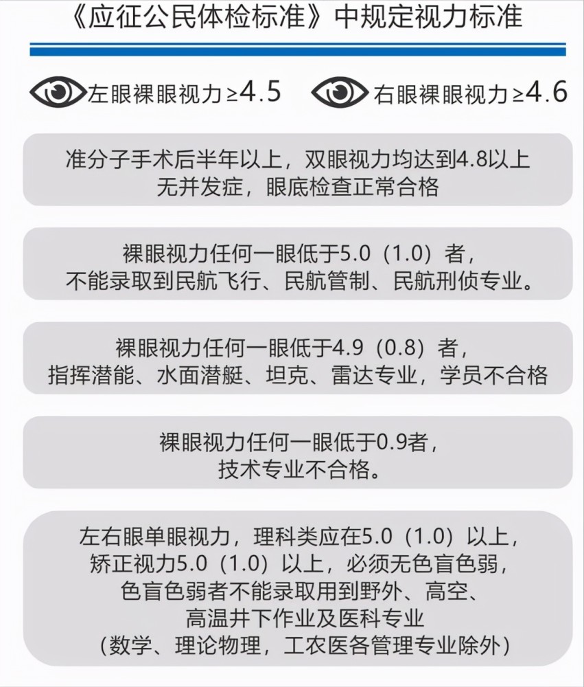 2、視力:視力是軍事活動中至關重要的能力,入伍體檢標準對視力有嚴格要求,包括裸眼視力和矯正視力,裸眼視力要求雙眼矯正視力不低于4.8,無色盲、色弱等視覺障礙。