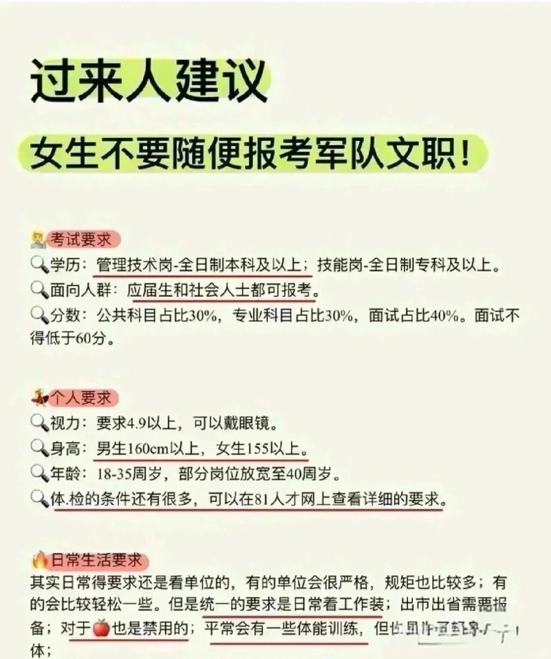 4、身體條件:女生考部隊文職需要通過體檢,保持良好的身體素質(zhì),以適應(yīng)部隊工作的需要。